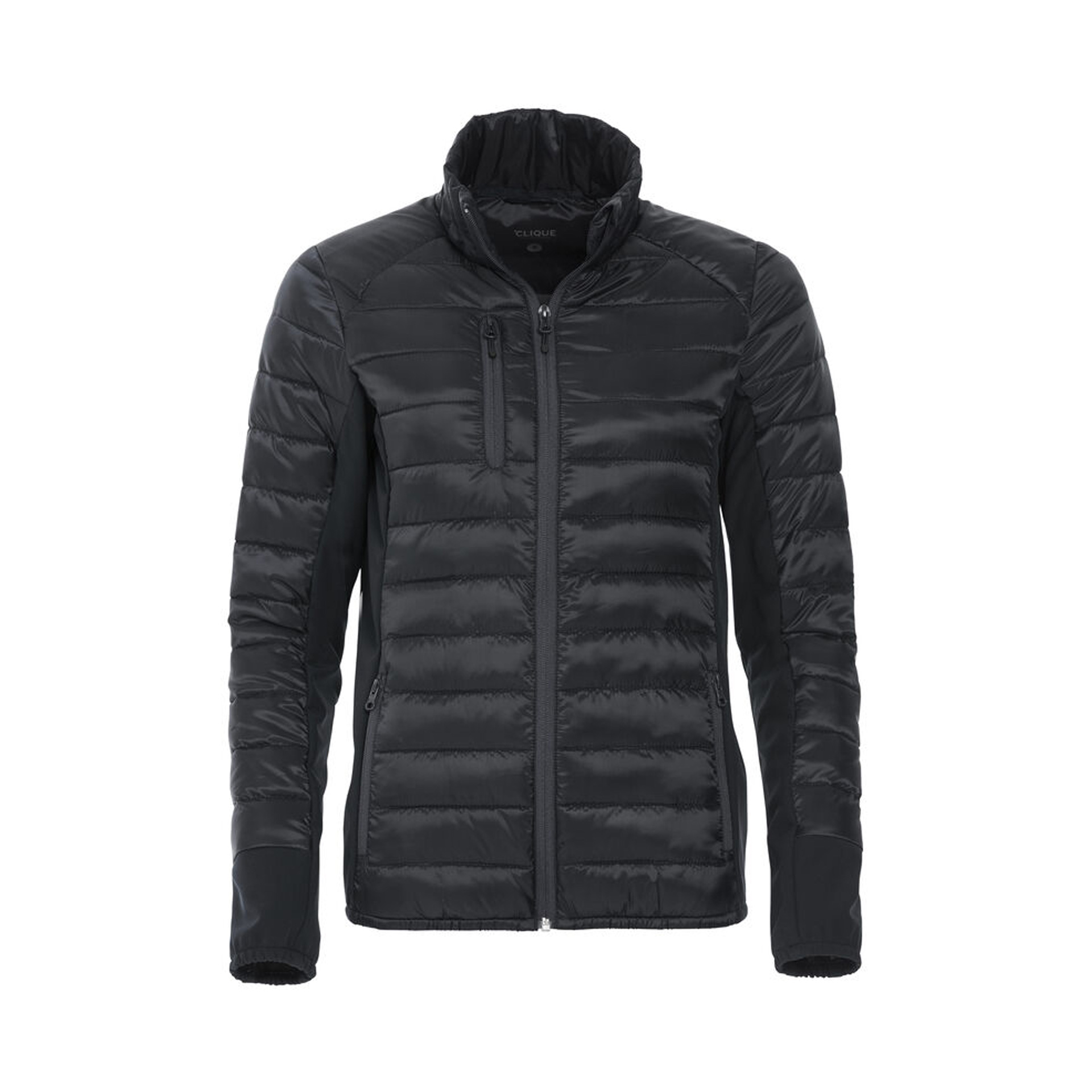 Moderne Hybrid Jacke mit Stehkragen, daunenähnlicher Füllung und Softshell Einsätzen. Drei Aussentaschen mit Reissverschlüssen und Kopfhörerführung Innen. Elastischer Bund am Ärmelabschluss.