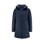 Längerer wattierter Mantel mit Zweiwege-Reiverschluss. Abnehmbare Kapuze mit Kordelzug verstellbar. Rippenbündchen am Kragen an der Ärmeln. Zwei Seitentaschen mit Reissverschluss. Innere Brusttasche mit Reissverschluss. Weicher gestrickter Stoff in den Seitentaschen. Verpackt in einer biobasierten, kompostierbaren Polybag.